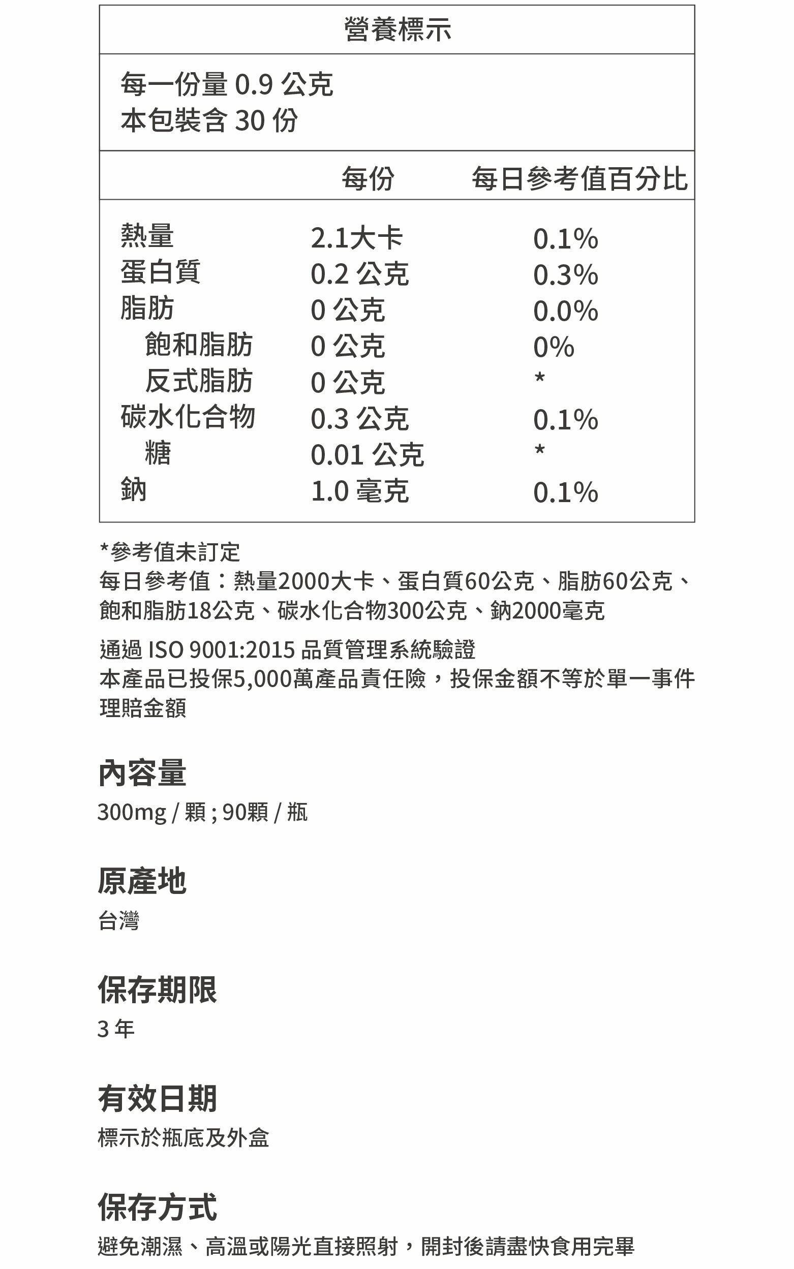 孵化蛋殼膜超臨界CO2萃取物(含孵化蛋殼膜、麥芽糊精)、魚膠原蛋白、龍眼核超臨界CO2萃取物(含龍眼核超臨界CO2萃取物、麥芽糊精)、玉米胚芽萃取物(含賽洛美)、流行鏈球菌發酵物(含玻尿酸、麥芽糊精)、Mesoporosil®正矽酸複合物(醋酸鈣、二氧化矽、微結晶狀α-纖維素、羥丙基纖維素)、西印度櫻桃萃取物(含維他命C)