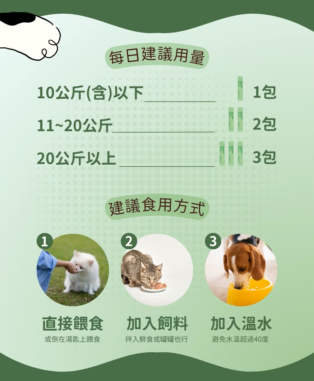 建議可直接添加於飼料或罐頭食品中同時服用,注意請勿添加於熱水中食用。