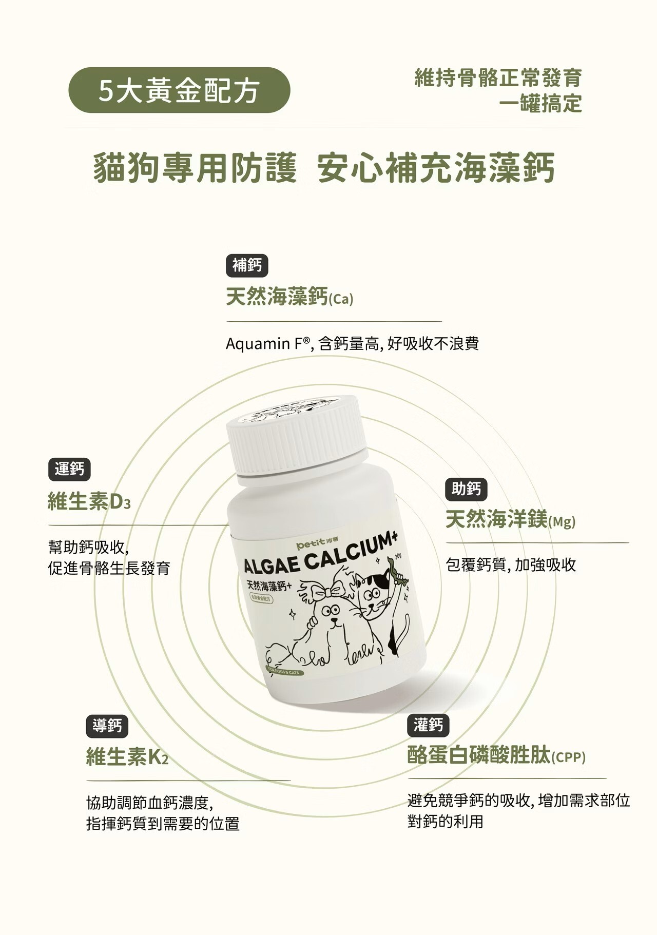 海藻鈣、麥芽糊精、酪蛋白水解物(含酪蛋白磷酸胜肽)、海水濃縮物(含鎂)、納豆菌發酵物(含維生素 K2)、維生素 D3