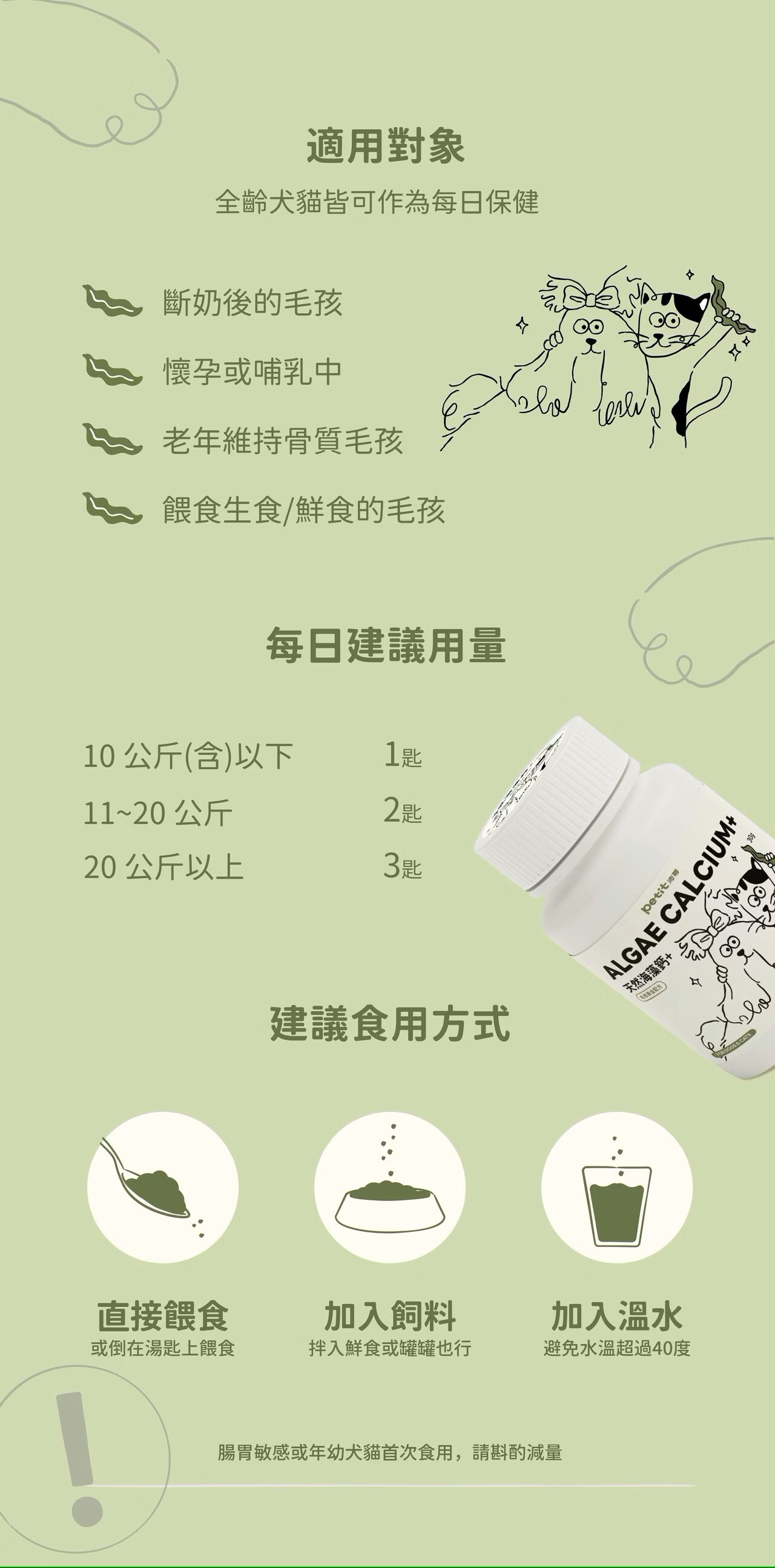 2.建議可直接添加於飼料或罐頭食品中同時服用,注意請勿添加於熱水中食用。