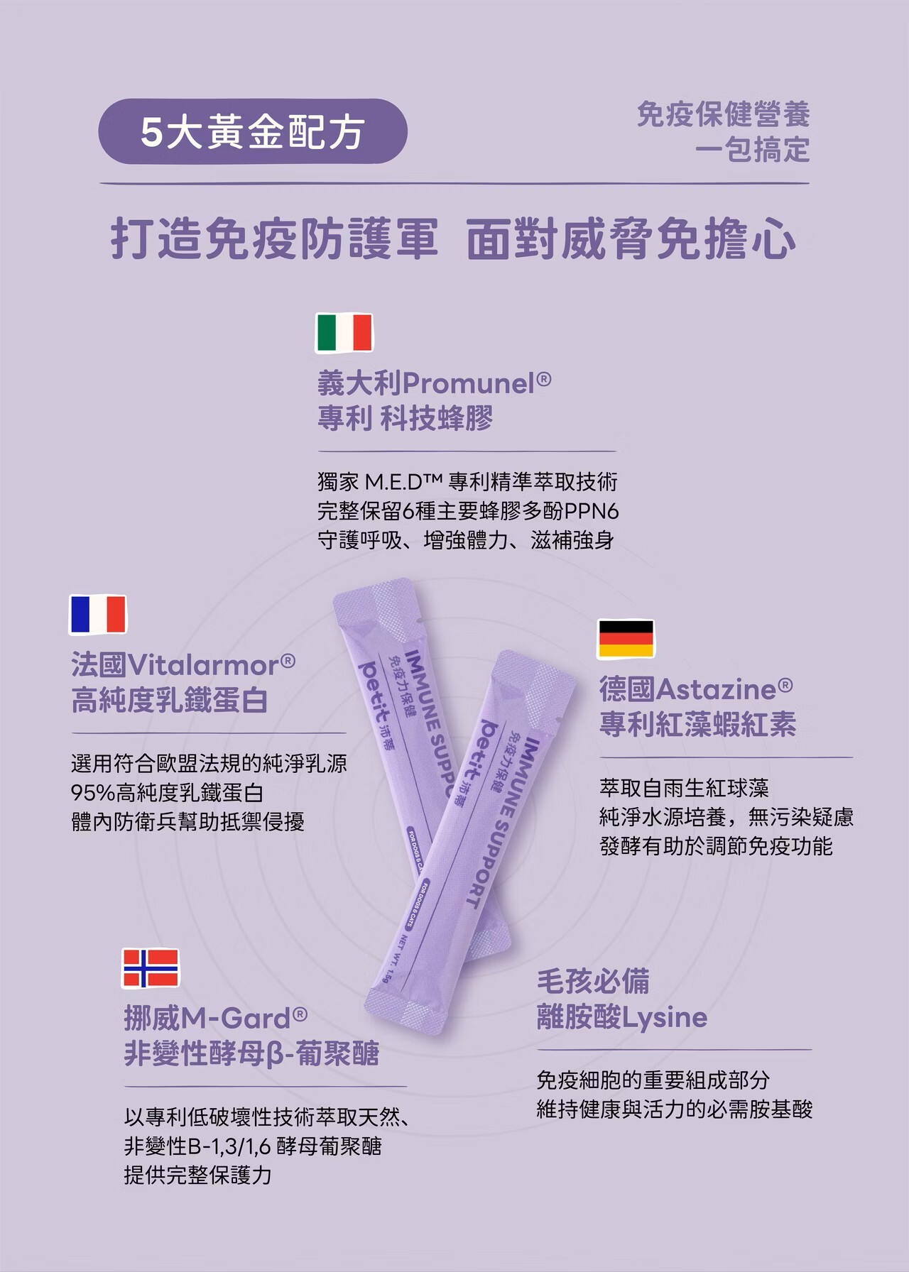 玉米來源可溶性纖維、雞肉粉、離胺酸、專利酵母β-聚葡萄糖、專利蜂膠萃取物、二氧化矽、紅藻萃取物(含蝦紅素)、乳鐵蛋白