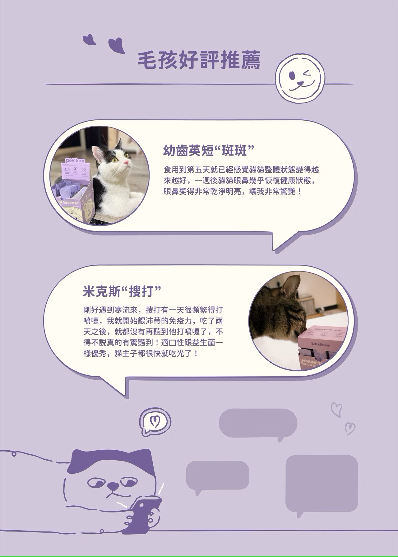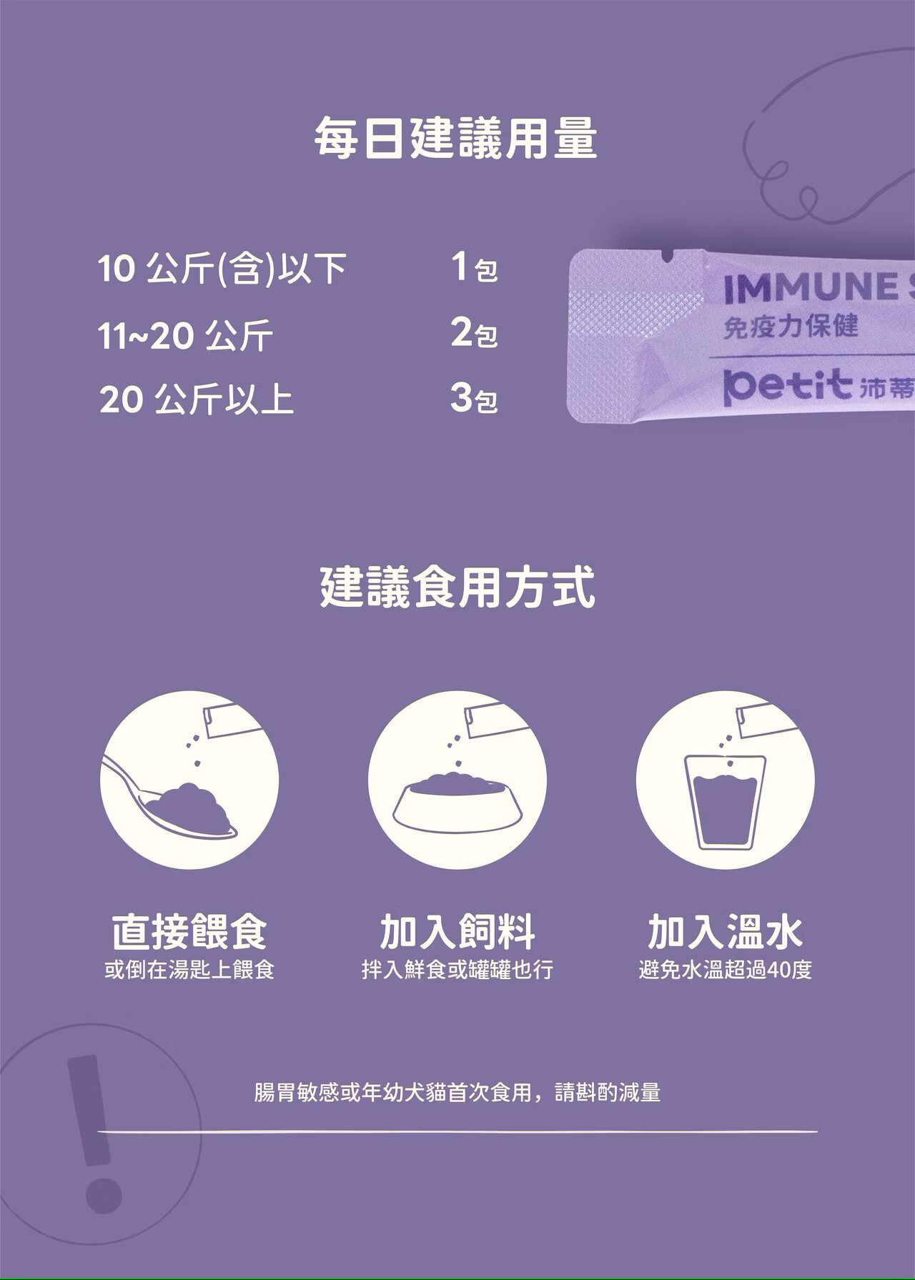 建議可直接添加於飼料或罐頭食品中同時服用,注意請勿添加於熱水中食用。