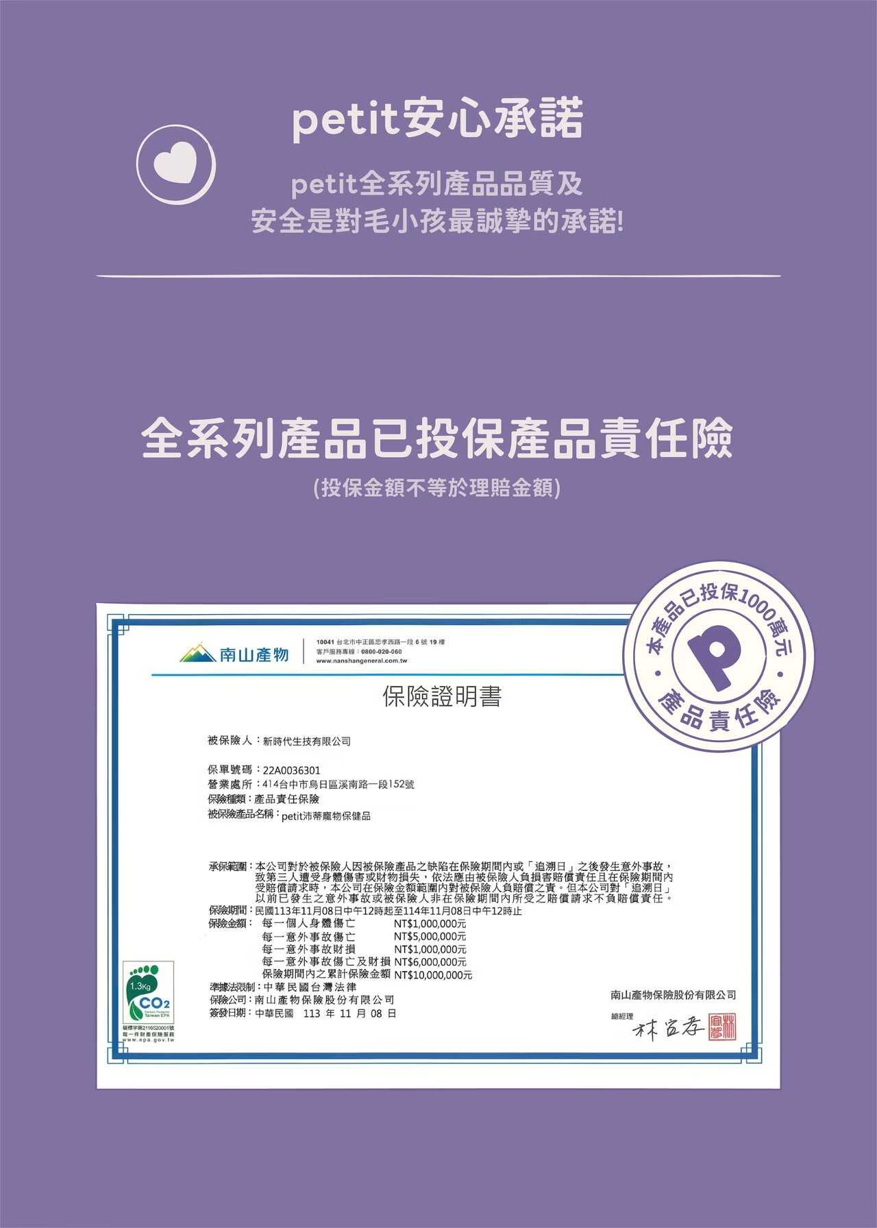 本產品已投保產品責任險,並完成行政院農委會寵物食品申報