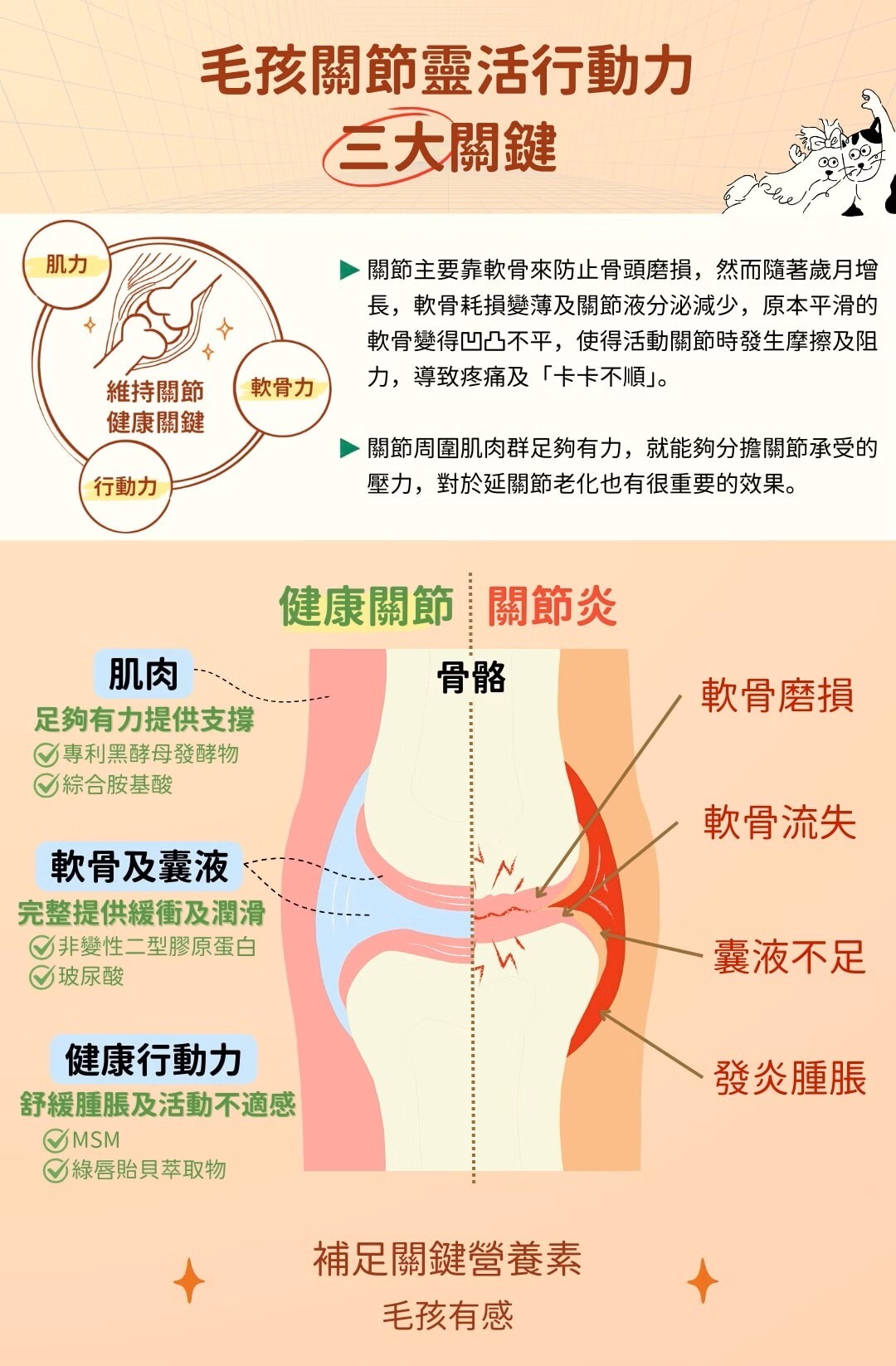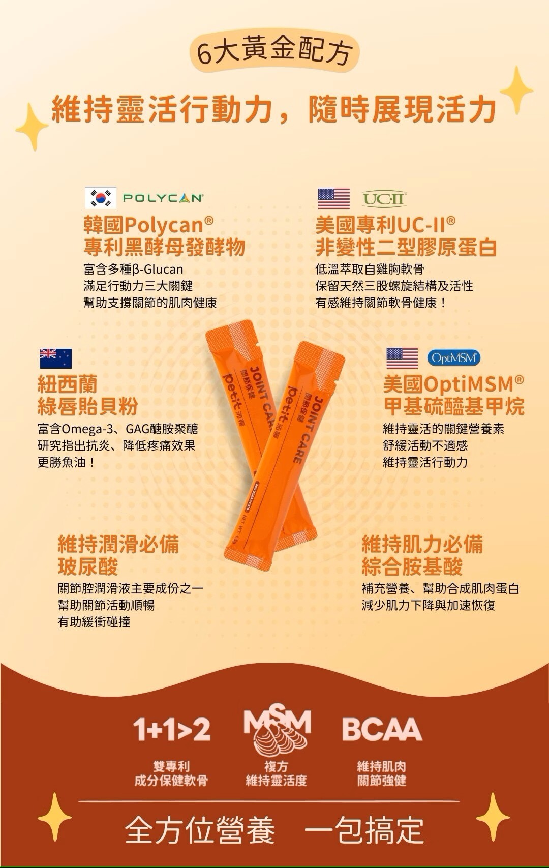 ✔ 軟骨力 | 足量添加專利UC-II:促使軟骨修復、幫助減少摩擦、舒緩衝擊力