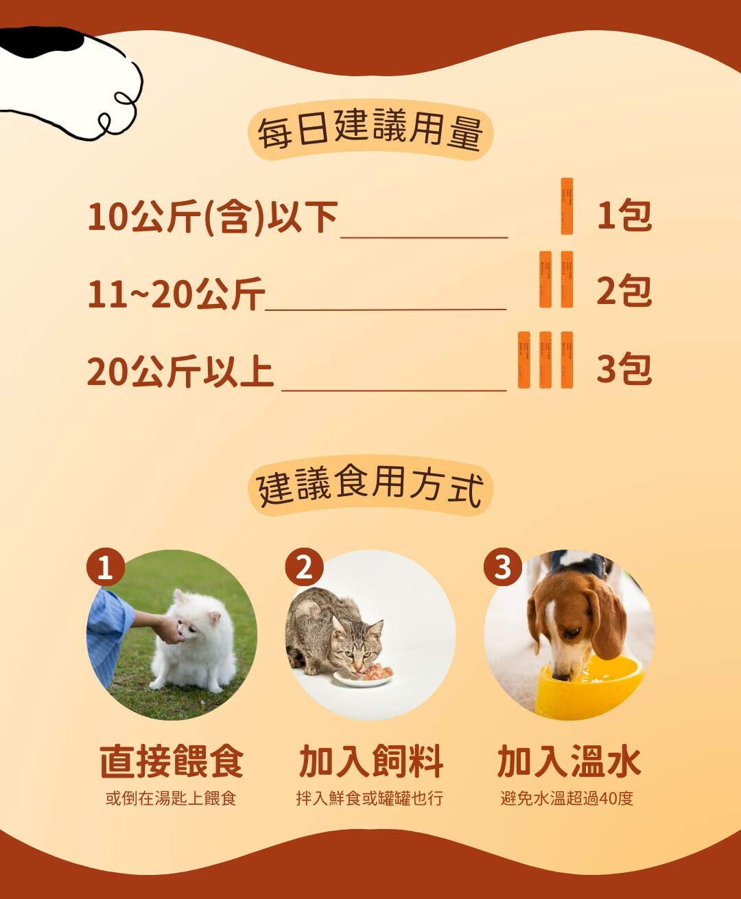 建議可直接添加於飼料或罐頭食品中同時服用,注意請勿添加於熱水中食用。