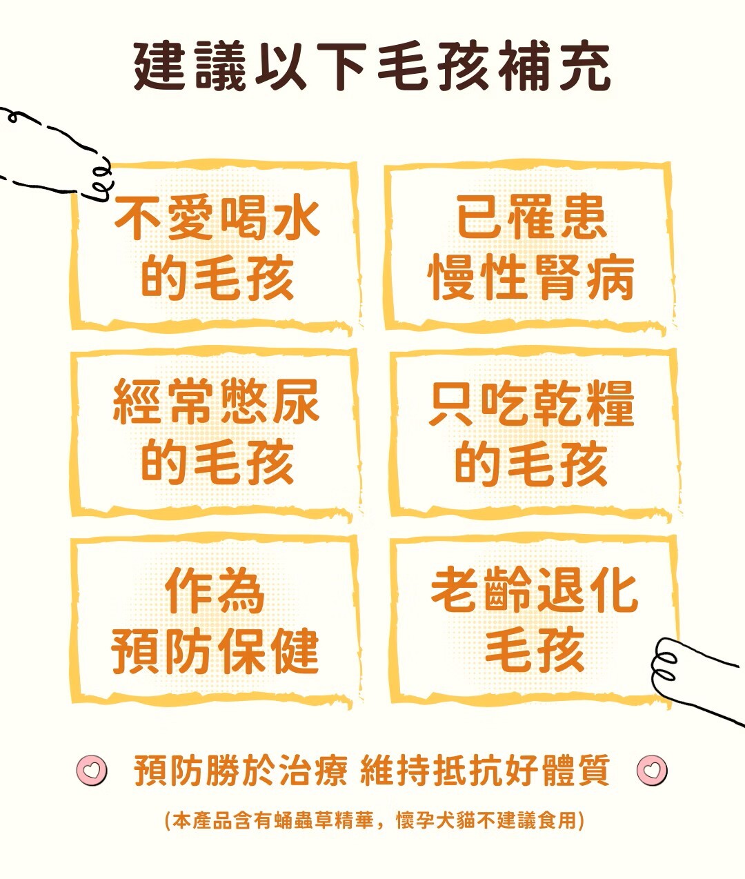 建議可直接添加於飼料或罐頭食品中同時服用,注意請勿添加於熱水中食用。