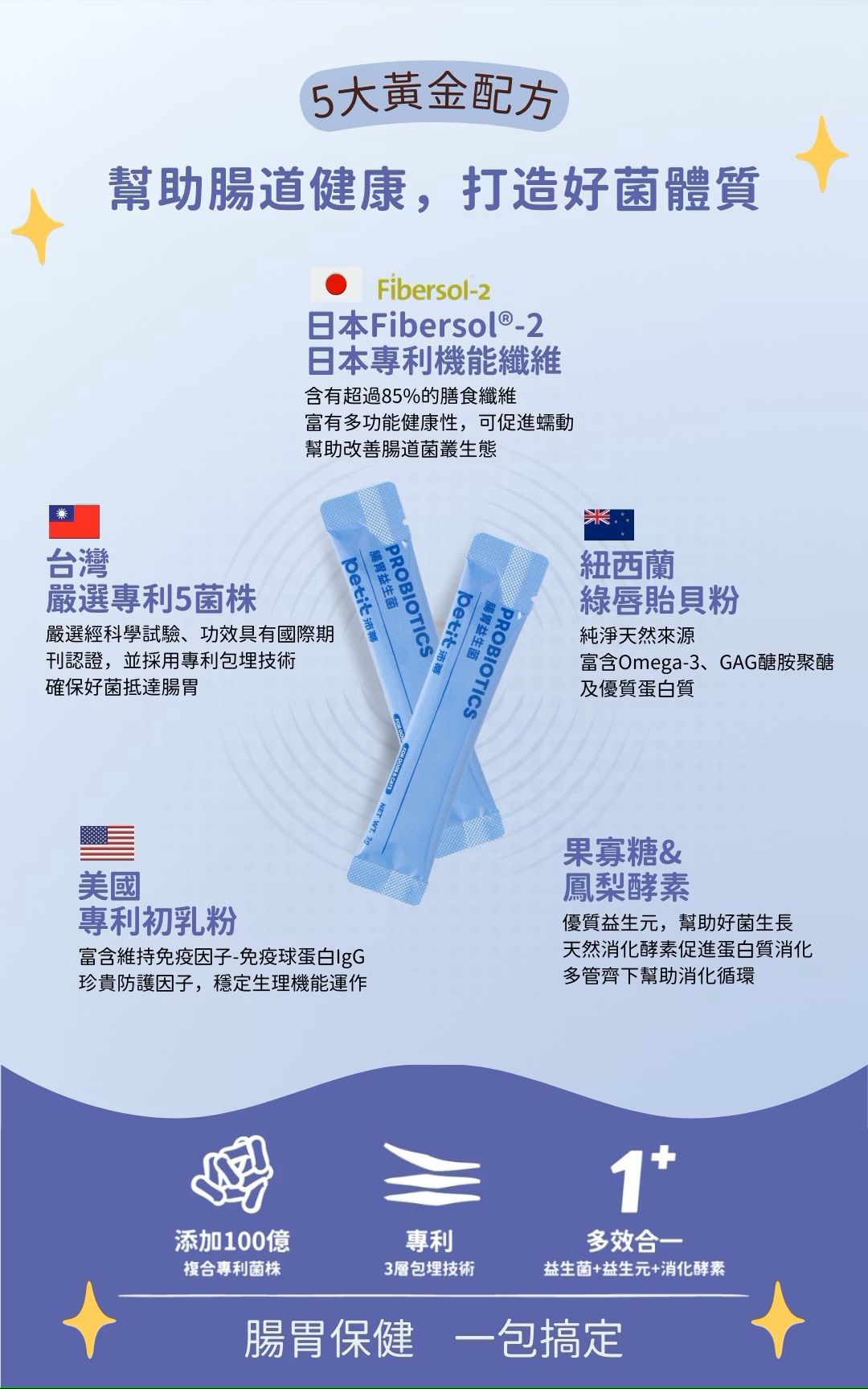 玉米來源可溶性纖維、碳酸鈣、酵母精粉、果寡糖、雞肉粉、複方益生菌(鼠李糖乳桿菌Lactobacillus rhamnosus、植物乳桿菌Lactobacillus plantarum、凝結芽孢桿菌Bacillus coagulans、副乾酪乳桿菌Lactobacillus paracasei、戊糖片球菌Pediococcus pentosaceus)、鳳梨萃取物(含鳳梨酵素)、綠貽貝粉、初乳粉