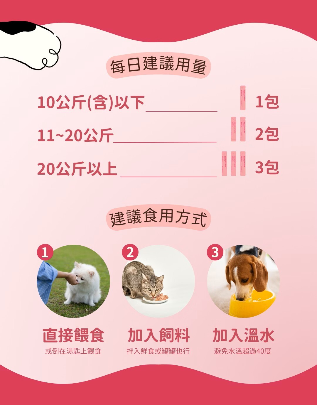 體重未滿10kg每日食用1包;11-20kg每日食用2包;20kg以上每日食用3包。